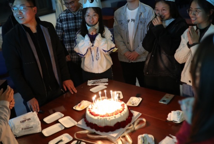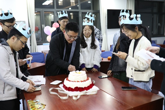 然后,进入了最重要的过生日环节,同学们都戴上生日帽,唱起生日歌,点蜡烛许愿,将聚会的气氛烘托到了顶点。吹灭蜡烛后,同学们开始品尝美味的生日蛋糕,享受自己生日喜悦的同时,也感受这份来自学院和导员的甜与关怀。