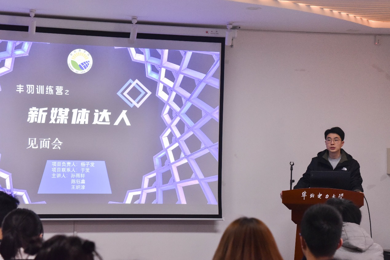其次,孙雨轩同学介绍了丰羽训练营的三位主讲人,并说明他们各自擅长的方向和技术。他通过展示利用PS、PR等技术做出的精美图片和视频动画,向同学们介绍本项活动将要开展的新媒体软件基础学习、案例分析和实战训练,鼓励同学们积极认真参与培训学习,实现“强技能、树志向”的活动愿景。同学们纷纷表示对接下来的培训活动充满期待!