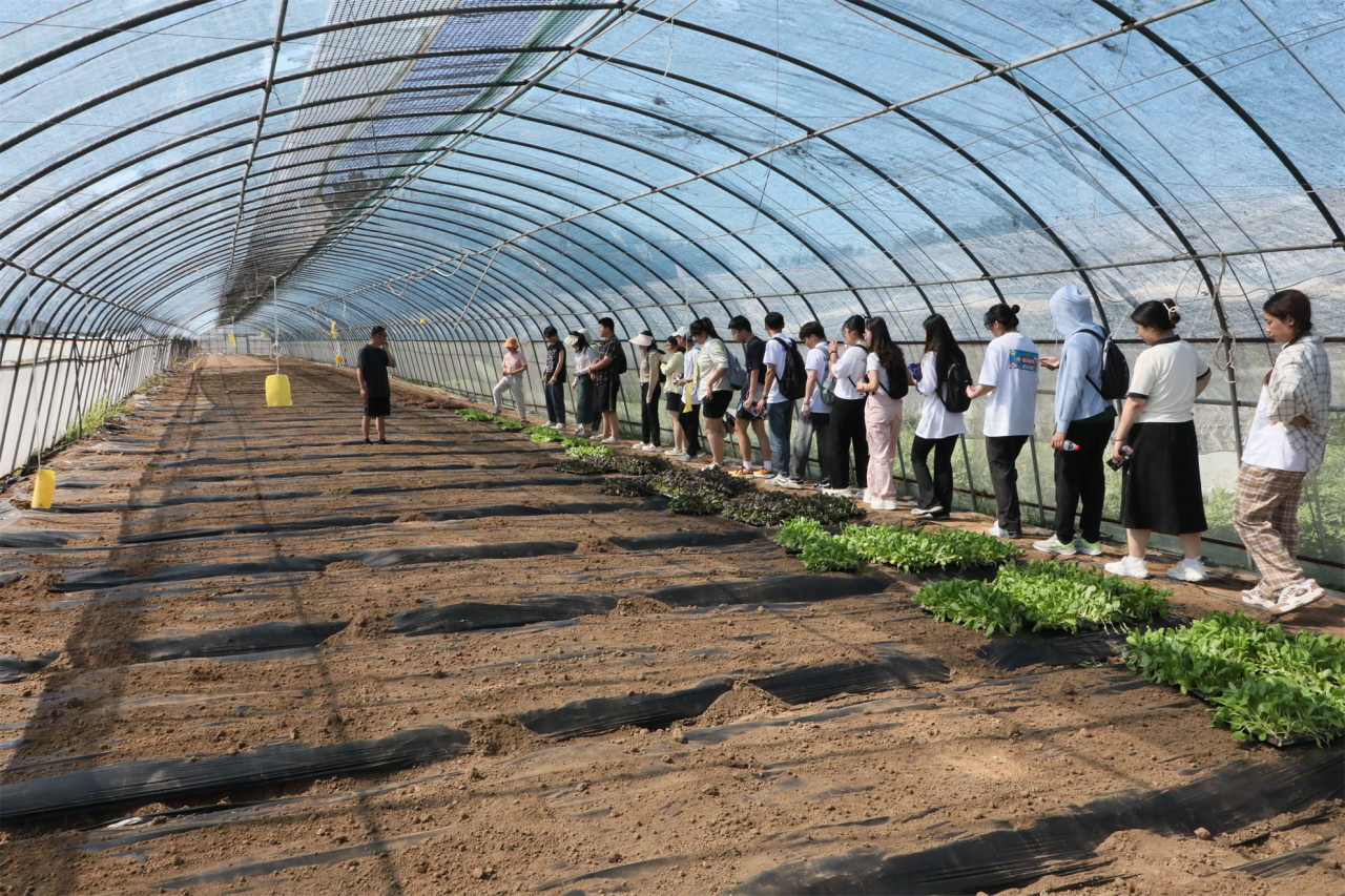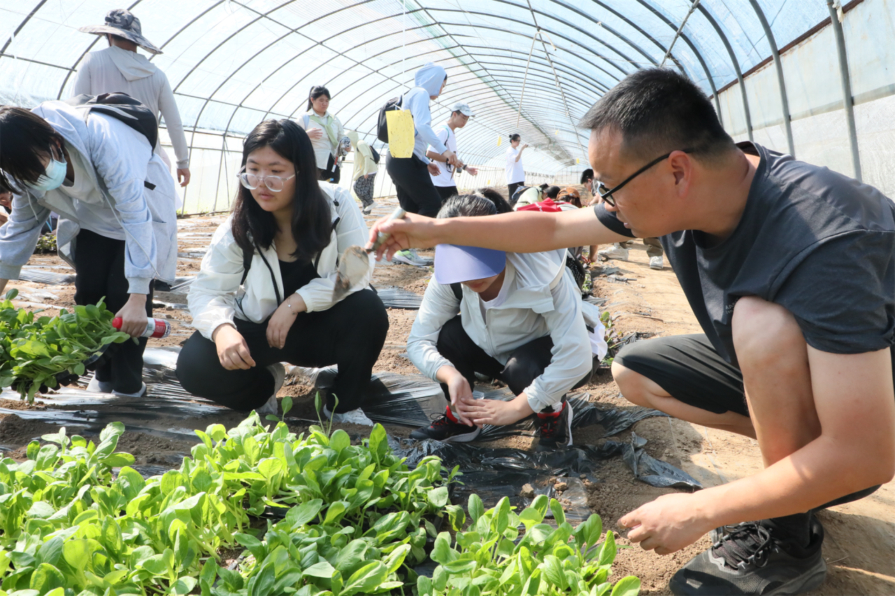 在诺亚农庄,经过工作人员的介绍,大学生们对有机蔬菜种植有了初步的了解和认识。随后,工作人员带着大学生们前往种植大棚,详细介绍了蔬菜幼苗栽种方法及步骤,并让他们进行实践种植。